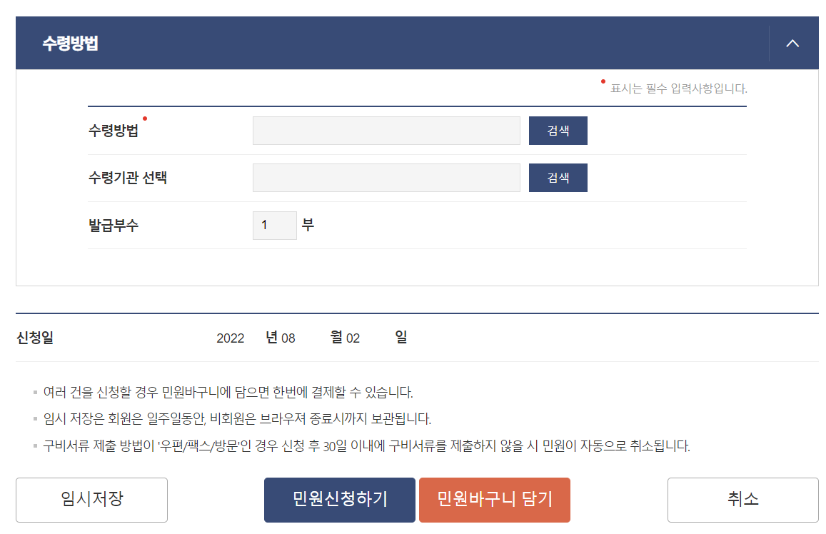 ▶ 수령방법은 온라인 발급(본일 출력)을 선택한 후 민원 신청하기를 누릅니다.