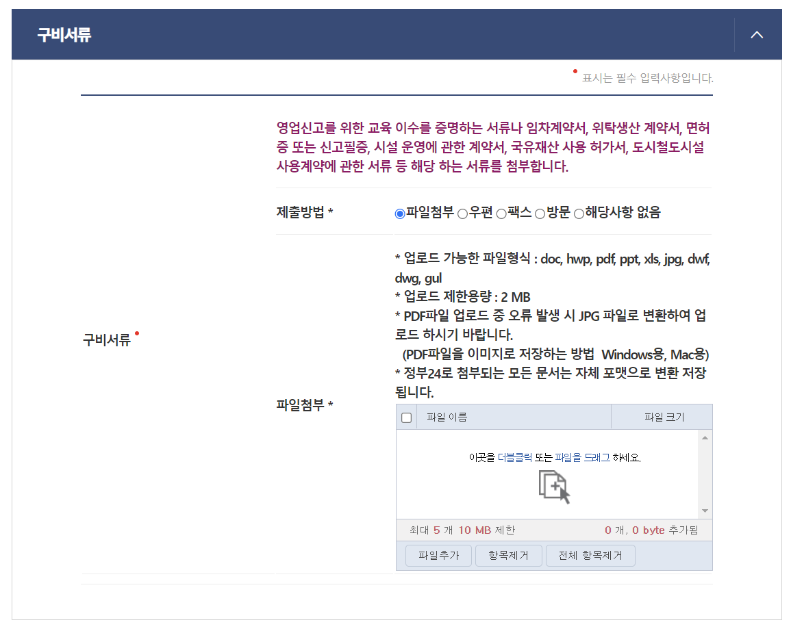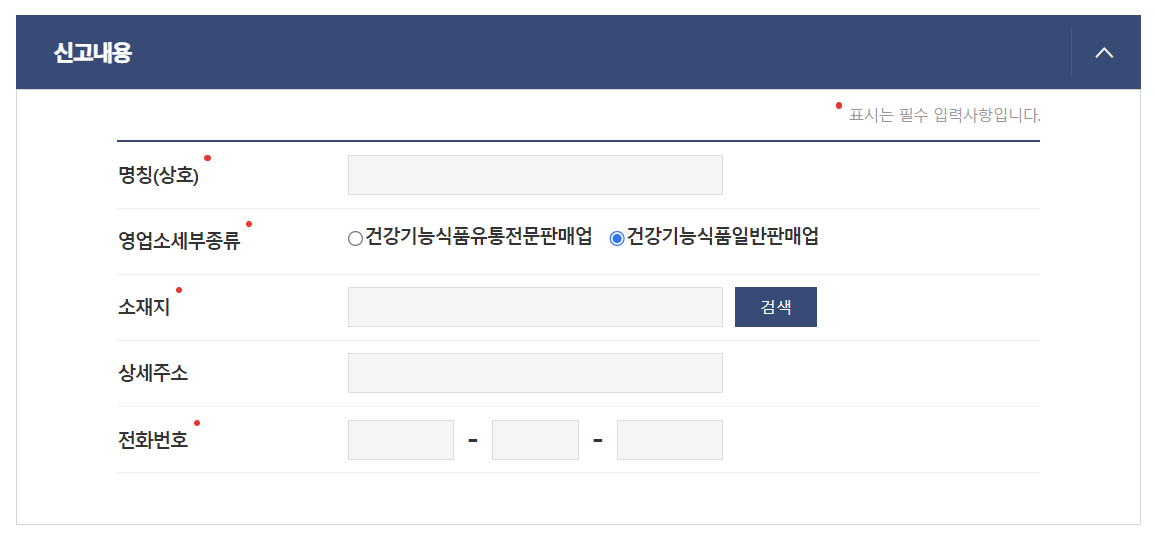 ▶ 아래와 같이 해당 정보를 기재하고 건강기능식품 일반판매업을 체크한 후 파일 첨부란에 건강기능식품교육센터에서 받은 수료증을 첨부합니다.