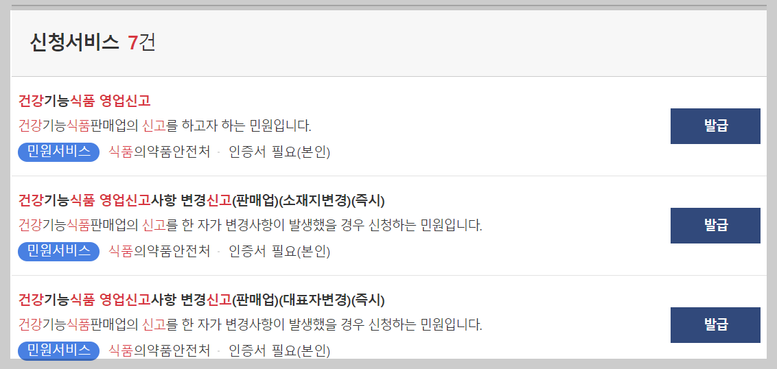 그러면 아래와 같이 건강식품에 관한 신청 서비스가 나오게 되는데 건강기능식품 영업신고 발급을 클릭합니다.