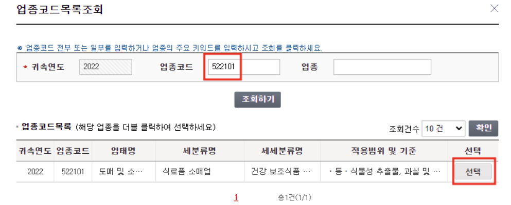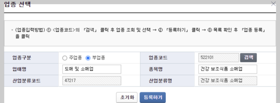건강보조식품 업종코드는 522101입니다. 업종코드를 등록하고 업종등록을 한 뒤 이후 파일 첨부란에 영업신고증을 등록하여 제출하면 업종 정정신청이 완료됩니다.