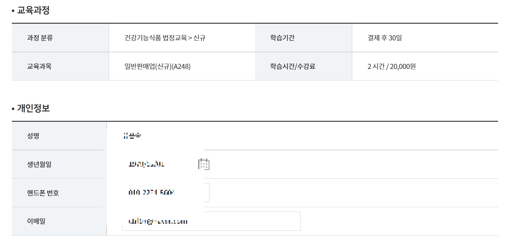 ▶ 이후에 간단한 개인정보 입력과 영업소 정보를 등록한 후 결제하면 교육을 받을 수 있습니다. 교육비는 20,000원이고 교육시간은 2~3시간 정도였던 것 같습니다. 하지만 교육이 살짝 지루하여 체감상으로 조금 더 길게 느껴지기도 했습니다.
