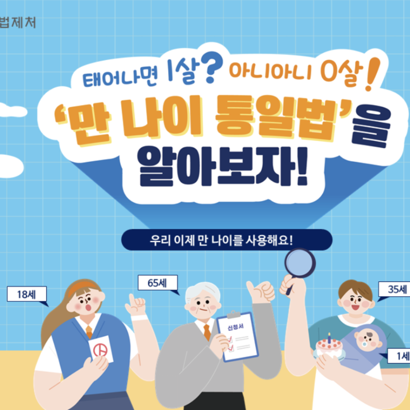 '만 나이'는 출생일 기준 0살로 시작하여 , 생일 지날 때마다 1살씩 더하는 방식으로 계산합니다. 즉 다 같이 1월 1일 1살씩 더하는 게 아니라 각자 생일에 1살씩 더하면 됩니다.