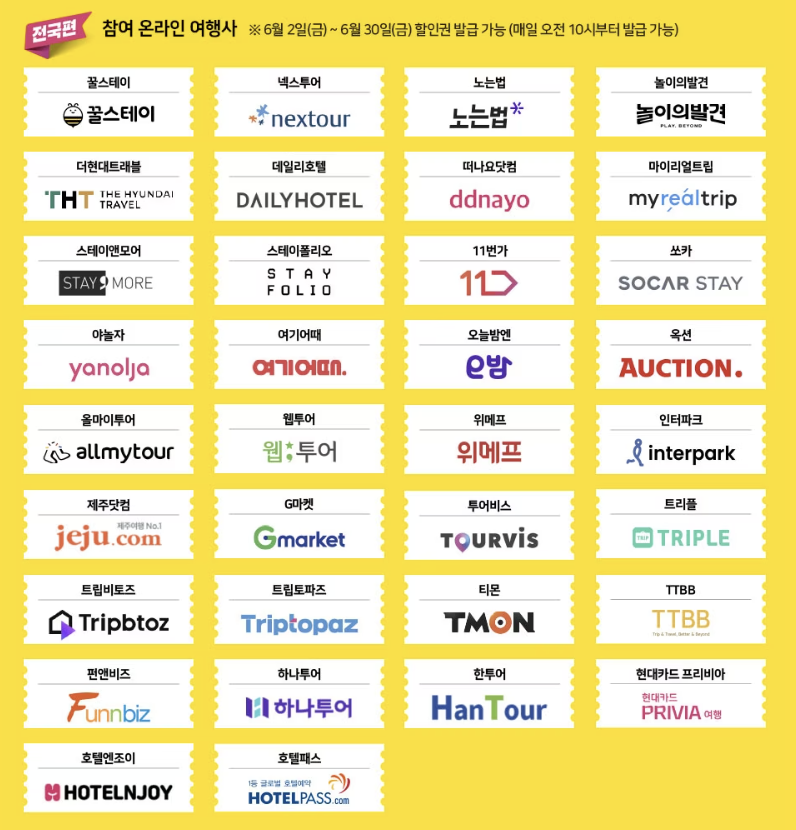 꿀스테이, 넥스투어, 노는법, 놀이의발견, 더현대트래블, 데일리호텔, 떠나요닷컴, 마이리얼트립 스테이앤모어, 스테이폴리오, 11번가, 쏘카, 야놀자, 여기어때, 오늘밤엔, 옥션, 올마이투어,웹투어 위메프, 인터파크, 제주닷컴, G마켓, 투어비스, 트리플, 트립비토즈, 트립토파즈, 티몬, TTBB, 펀앤비즈 하나투어, 한투어, 현대카드 프리비아, 호텔엔조이, 호텔패스 |
