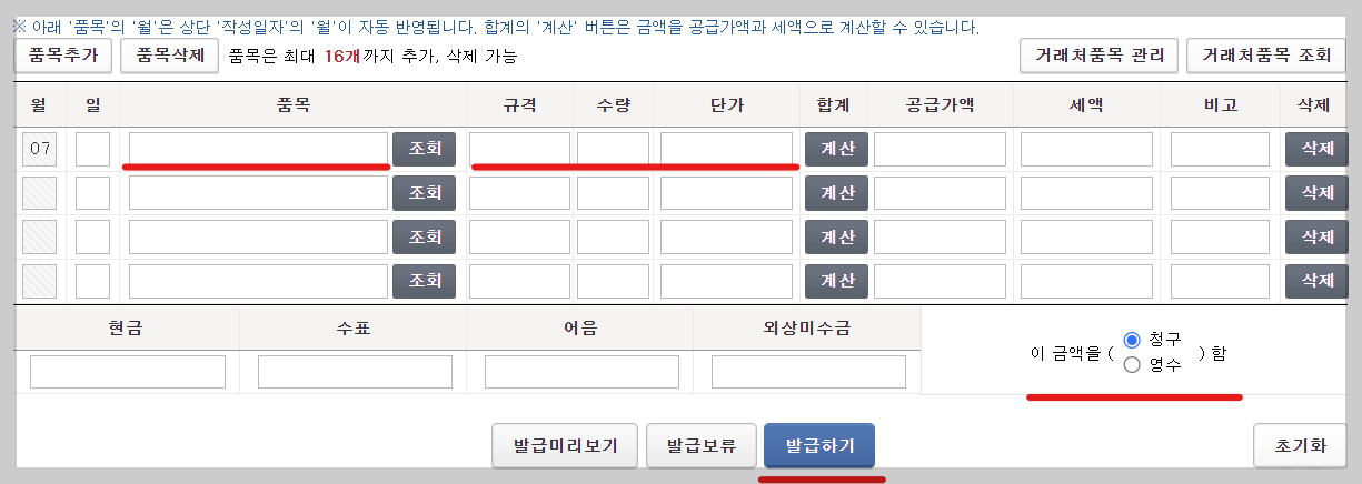 5. 위에 사업자번호 및 정보를 기재한 후 아래에 상품명, 규격, 수량, 단가를 기재하고 계산을 누르면 자동으로 공급가액 및 세액이 계산이 되고 합계가 자동 계산 됩니다. 하단의 청구 및 영수를 선택한 후 발급하기를 누르면 세금계산서가 발행됩니다. 이때 메일주소를 기재할 경우 메일주소로 세금계산서가 보내집니다.
