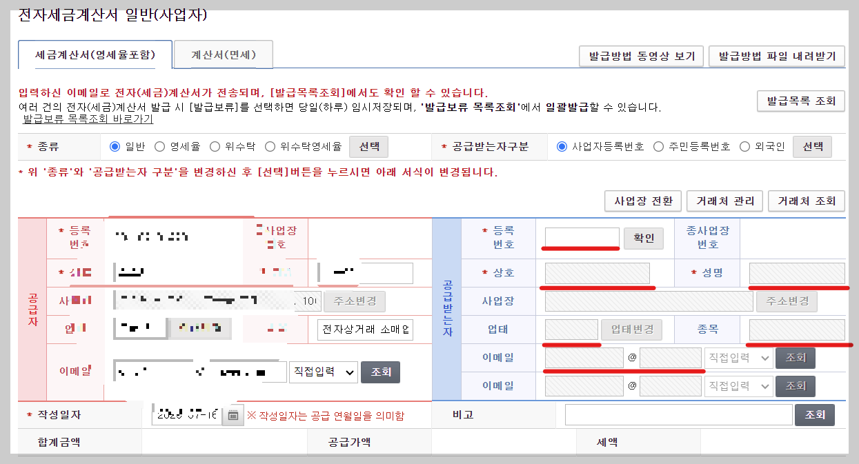 4. 왼쪽은 본인 사업자번호 및 정보가 자동으로 뜨고 오른쪽 파란색 쪽에 세금계산서발행을 원하는 사업장의 사업자등록번호 및 상호 대표자 성명, 업태, 종목, 메일 등을 기재하면 됩니다.(업태, 종목, 메일을 기재하지 않아도 발행은 가능합니다)